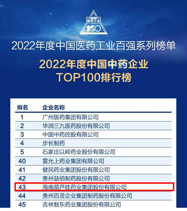会议期间,一年一度的中国医药工业百强系列榜单隆重揭晓,z6尊龙药业集团凭借领先的研发优势和扎实的生产实力以及稳健的市场推广能力,连续第四年成功入选“2022年度中国中药企业TOP100排行榜” ,排名稳步上升至第43位。